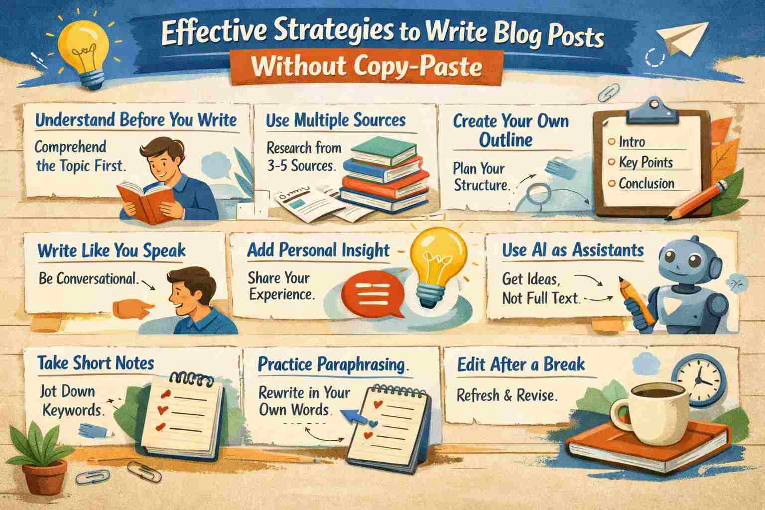 কপি-মুক্ত ব্লগিং আমি যেভাবে অভ্যাসে পরিণত করেছি: আমি বুঝেছি, কপি-পেস্ট ছাড়াই লেখা কোনো একদিনের সিদ্ধান্ত না, এটা একটা অভ্যাস। তাই আমি নিজের জন্য একটি নির্দিষ্ট রুটিন তৈরি করেছি। আমি নিয়ম করে নোট নেই, নিজের শেখা বিষয় লিখে রাখি এবং প্রতিটি পোস্টে অন্তত একটি ব্যক্তিগত অভিজ্ঞতা যোগ করার চেষ্টা করি। এতে করে কনটেন্ট স্বাভাবিকভাবেই ইউনিক হয় এবং অন্যের লেখা দেখে লেখার প্রয়োজন পড়ে না।