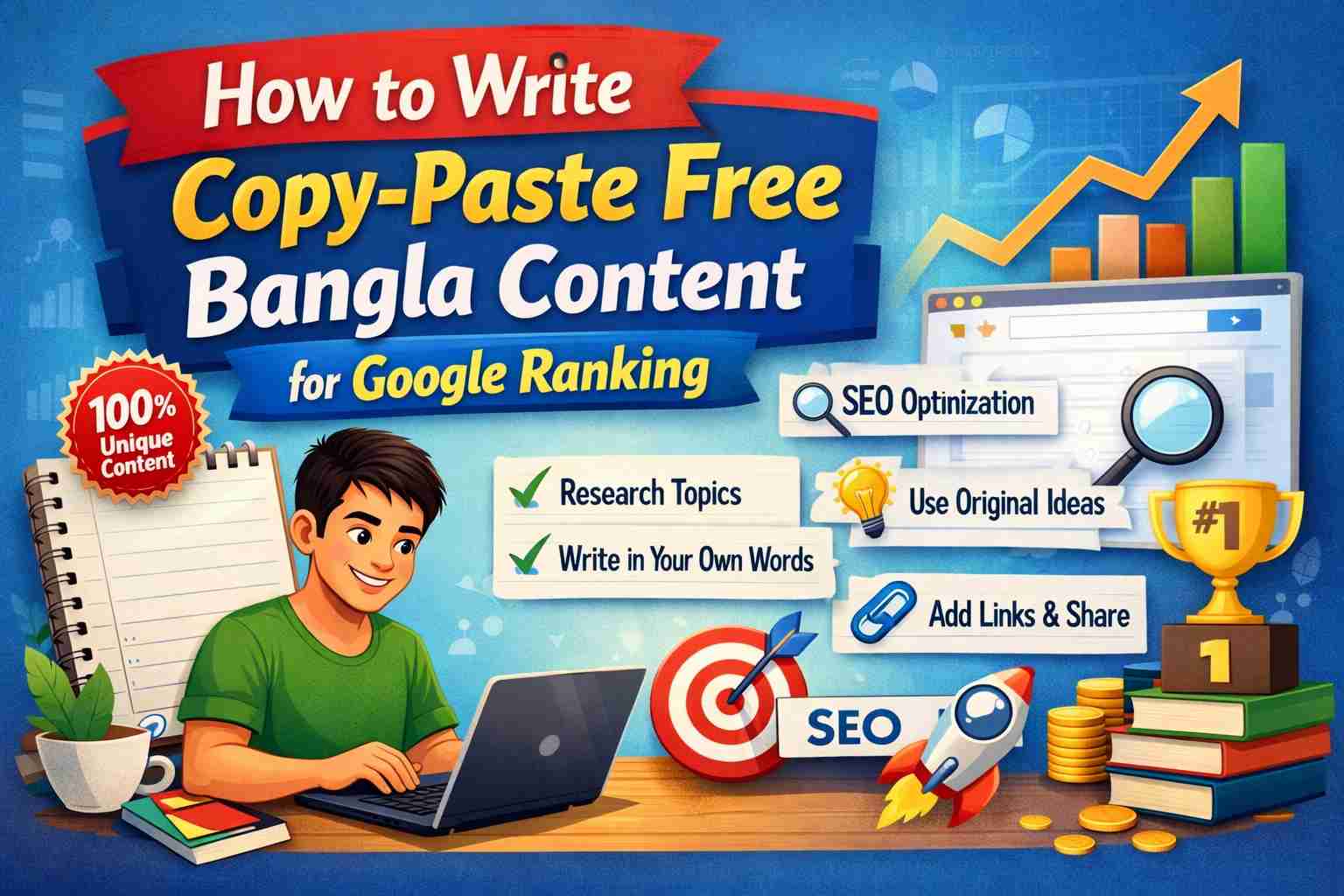 গুগলে র্যাঙ্ক পাওয়ার জন্য কপি-পেস্ট ফ্রি বাংলা কনটেন্ট লেখার বাস্তব উপায়, রিসার্চ কৌশল ও SEO-friendly টিপস নিয়ে সম্পূর্ণ গাইড।