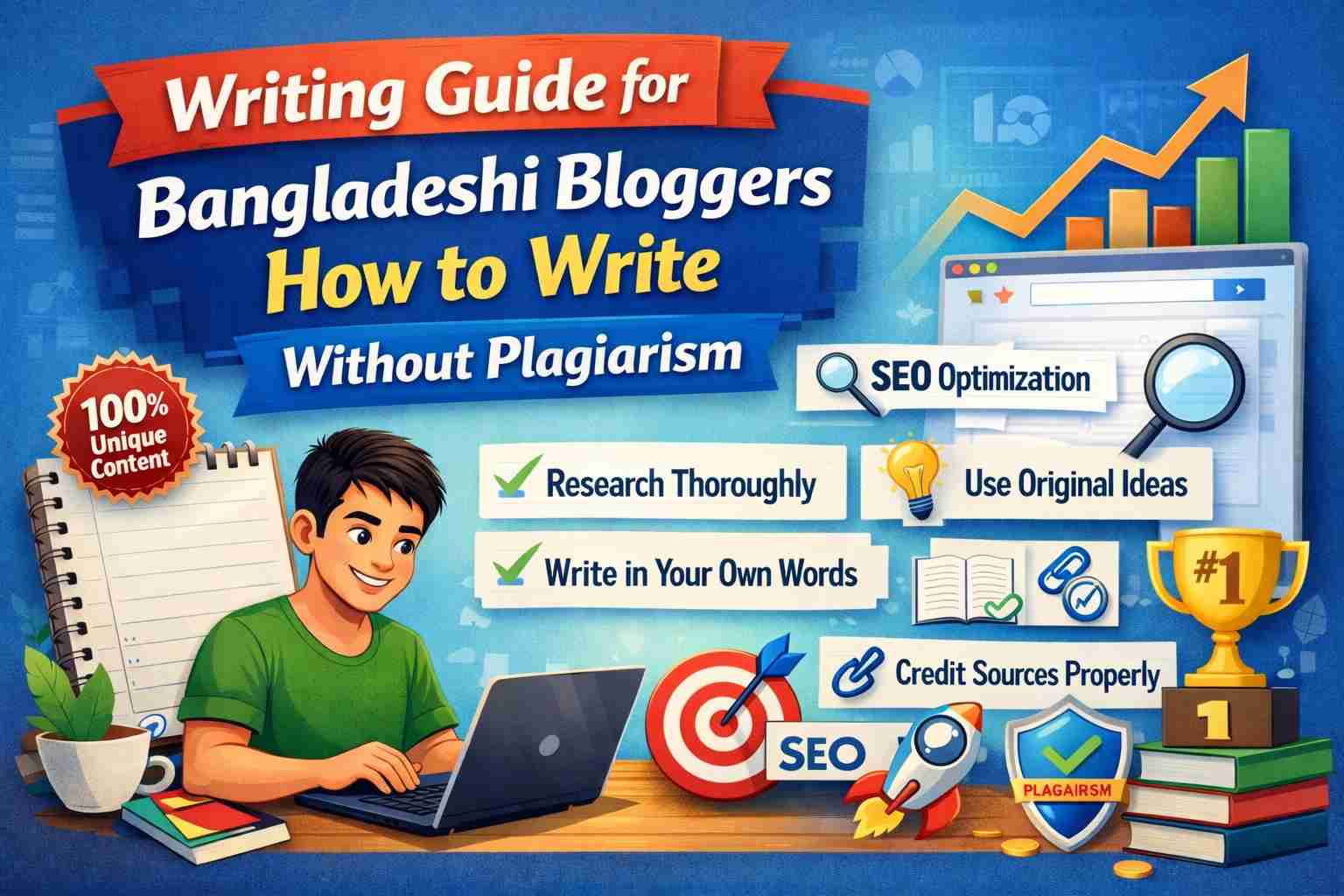 এই গাইডে আমি কোনো বইয়ের কথা বা তাত্ত্বিক নিয়ম বলিনি। বরং নিজের বাস্তব অভিজ্ঞতা, প্র্যাকটিক্যাল কৌশল এবং বাস্তব উদাহরণ দিয়ে দেখিয়েছি—বাংলা ব্লগাররা কীভাবে প্লেজিয়ারিজম ছাড়াই SEO-friendly কনটেন্ট লিখতে পারে। আপনি যদি নতুন বা মাঝামাঝি পর্যায়ের ব্লগার হন এবং দীর্ঘমেয়াদে গুগলে র‍্যাঙ্ক করতে চান, তাহলে এই লেখাটি আপনার জন্য একটি নির্ভরযোগ্য রোডম্যাপ হিসেবে কাজ করবে।