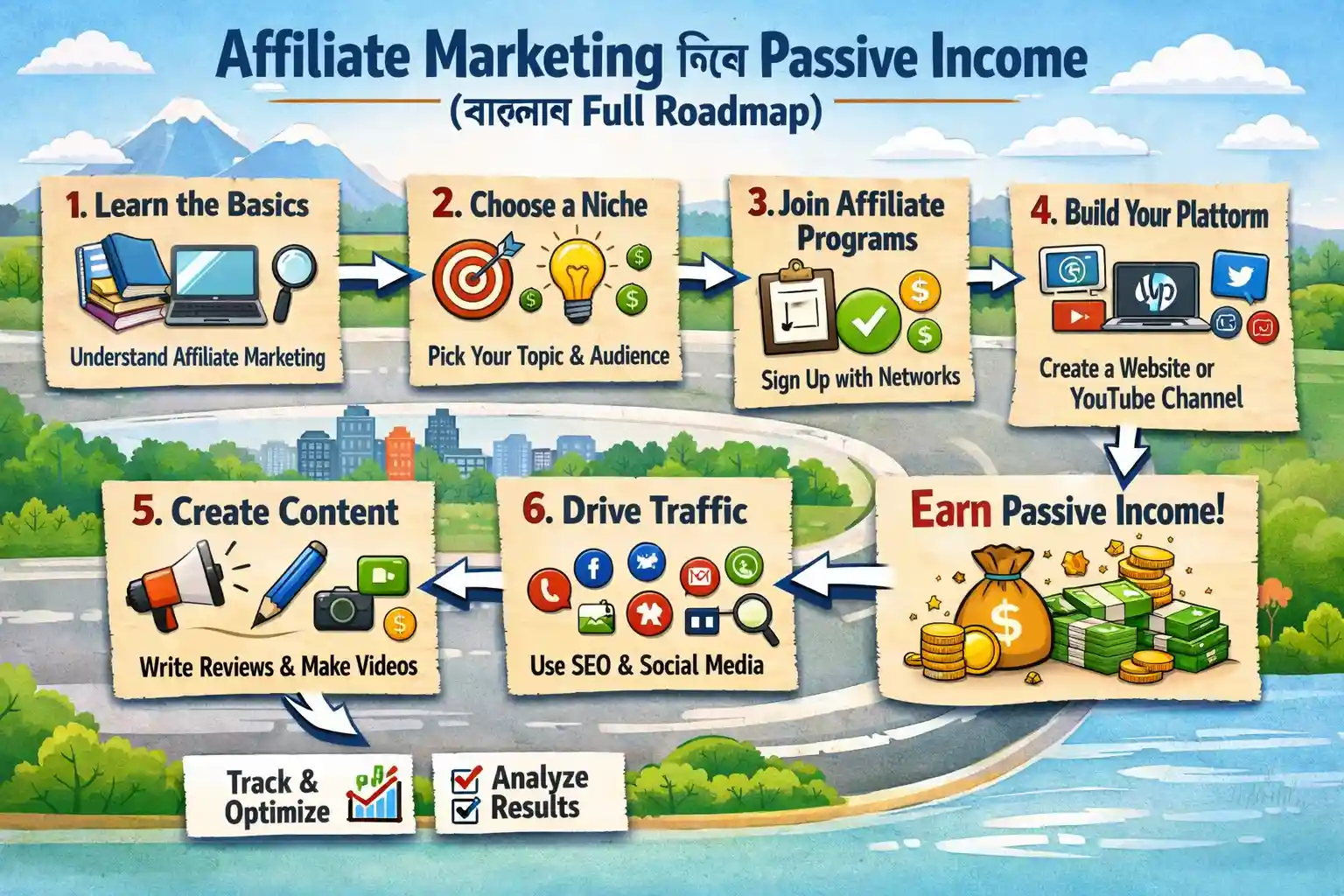 আমি এই গাইডটা লিখেছি তাদের জন্য, যারা অনলাইনে ইনকাম করতে চায় কিন্তু চায় একটা স্মার্ট, টেকসই আর স্কেলেবল উপায় শুধু আজকের জন্য না, আগামী দিনের জন্যও। Affiliate Marketing এমন একটা সুযোগ যেখানে আমি নিজের প্রোডাক্ট ছাড়াই ইনকাম করতে পারি, যদি আমি সঠিক সিস্টেম বানাতে পারি। এই বইতে আমি কোনো শর্টকাট বা ফাঁকা প্রতিশ্রুতি দিইনি; আমি দেখিয়েছি কীভাবে শুরু থেকে ধাপে ধাপে একটি কাজ করা Affiliate System বানানো যায় niche নির্বাচন থেকে শুরু করে ট্রাফিক, কনভার্সন, স্কেলিং আর রিস্ক ম্যানেজমেন্ট পর্যন্ত। আমি নিজে যে ভুলগুলো করেছি, যে জিনিসগুলো কাজ করেছে, আর যে ফ্রেমওয়ার্কগুলো বাস্তবে ফল দিয়েছে সেগুলোই এখানে শেয়ার করেছি। আপনি যদি চান আন্দাজে না গিয়ে ডেটা, সিস্টেম আর স্ট্র্যাটেজির উপর ভর করে Passive income তৈরি করতে, তাহলে এই রোডম্যাপ আপনার জন্যই।