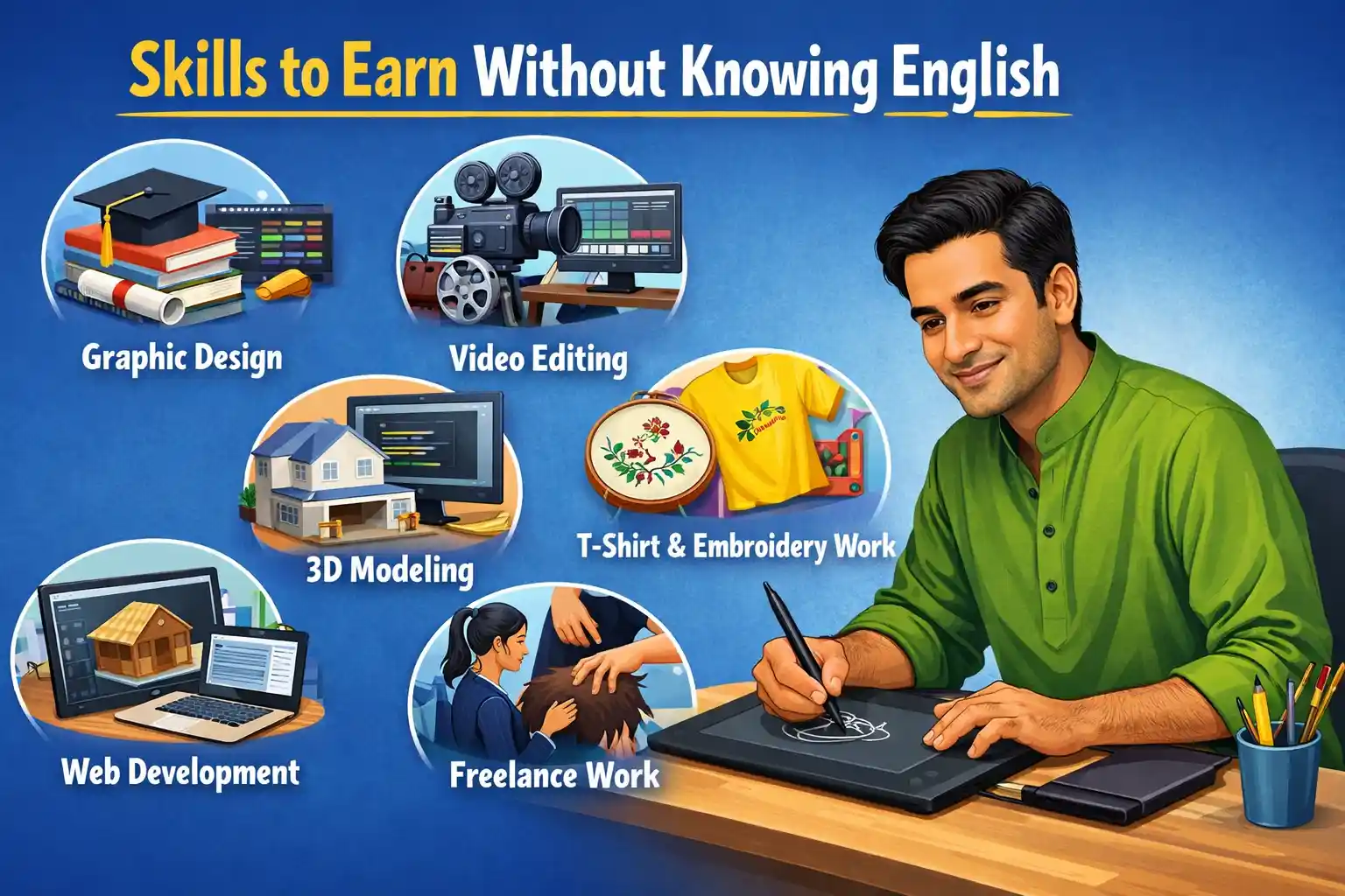 অনেকেই মনে করেন অনলাইনে আয় করতে হলে অবশ্যই ভালো ইংরেজি জানা লাগবে, কিন্তু বাস্তবতা হলো বর্তমান ডিজিটাল যুগে ইংরেজি না জানলেও দক্ষতা থাকলে আয় করা একদম সম্ভব। বাংলাদেশসহ সারা বিশ্বে এখন লোকাল মার্কেট, সোশ্যাল মিডিয়া, ফেসবুক বিজনেস, ইউটিউব, ফ্রিল্যান্সিং এবং ই-কমার্সের মাধ্যমে হাজার হাজার মানুষ বাংলা ভাষায় কাজ করে ইনকাম করছে। এই আর্টিকেলে আমি এমন ১০টি স্কিল শেয়ার করেছি যেগুলো আপনি ঘরে বসে, অল্প পুঁজি নিয়ে এবং ইংরেজি না জেনেও শিখতে ও ব্যবহার করতে পারবেন। আপনি যদি স্টুডেন্ট হন, চাকরি খুঁজছেন, কিংবা অতিরিক্ত ইনকাম করতে চান এই স্কিলগুলো আপনার জন্য বাস্তব সুযোগ তৈরি করতে পারে। সবচেয়ে গুরুত্বপূর্ণ বিষয় হলো, শুরু করা এবং ধৈর্য ধরে লেগে থাকা। এই গাইডটি আপনাকে সেই পথটা সহজ করে দেখানোর জন্যই তৈরি করা হয়েছে।