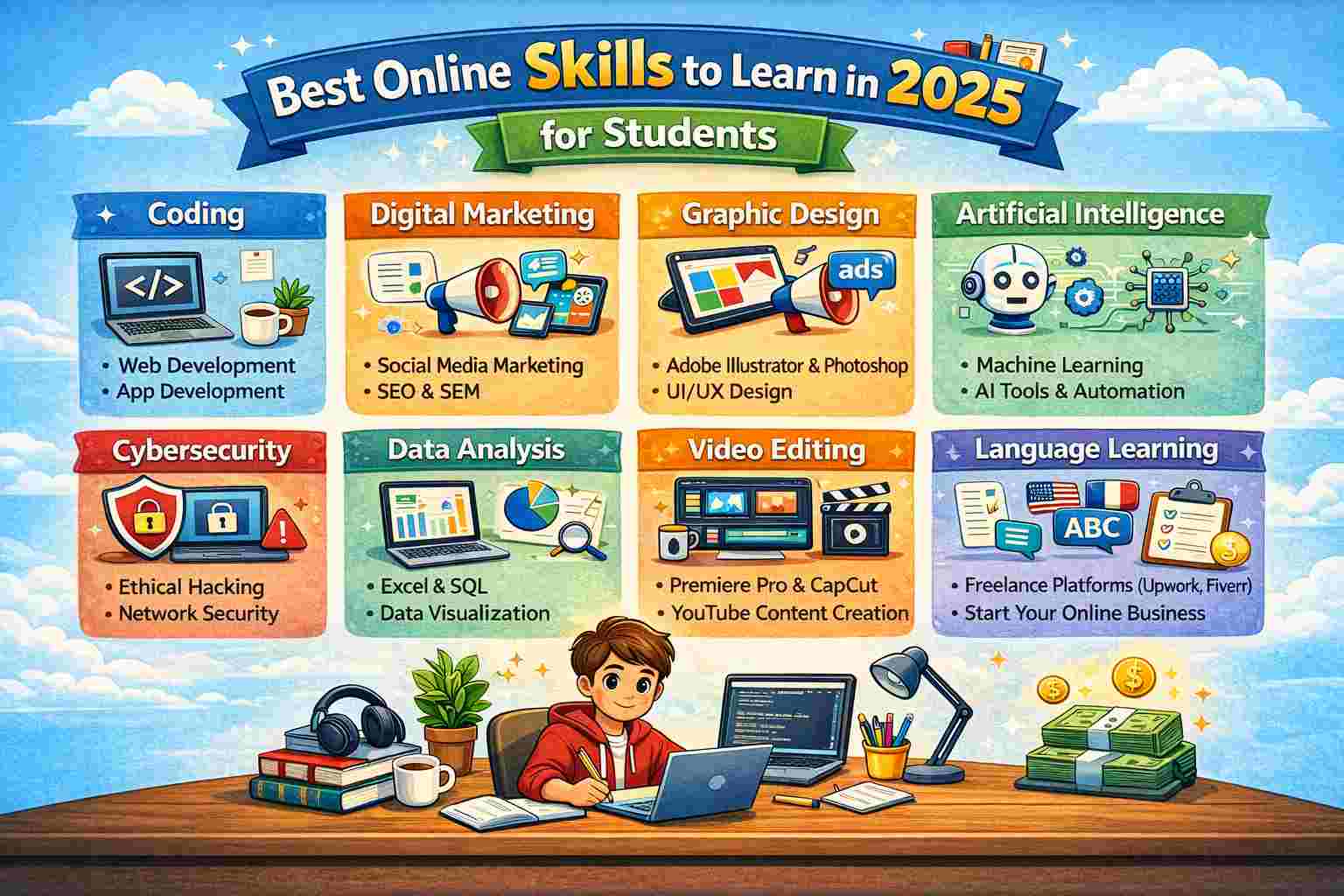এখানে আমি এমন ১০টি অনলাইন স্কিল তুলে ধরেছি যেগুলো ২০২৫ সালে স্টুডেন্টদের জন্য সবচেয়ে বেশি ভ্যালু তৈরি করবে আয়, ক্যারিয়ার এবং গ্লোবাল সুযোগের দিক থেকে। যদি তুমি আজ থেকেই শেখা শুরু করো, তাহলে তুমি শুধু একজন স্টুডেন্ট থাকবে না, বরং একজন ভবিষ্যৎ-রেডি প্রফেশনাল হয়ে উঠবে।